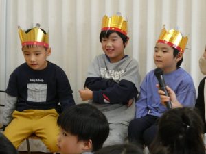 お誕生児のお友だちには、好きな食べ物や、好きな遊び、好きなお友だちをインタビューしました。好きなお友だちを答える場面では、お互い嬉しそうな表情を浮かべていて、心がほっこりしました。