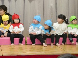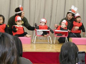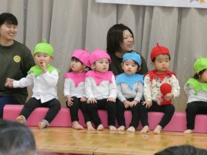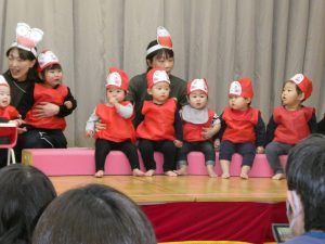 未満児は好きな絵本や歌を取り入れ、普段の様子を発表出来るようにしました。