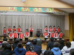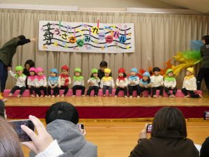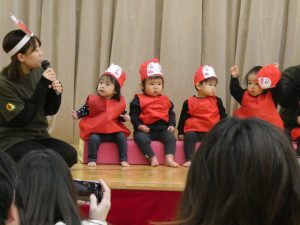 未満児は好きな絵本や歌を取り入れ、普段の様子を発表出来るようにしました。