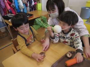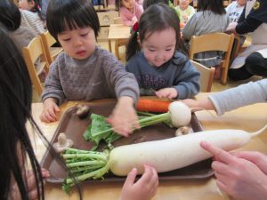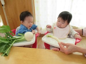 未満児クラスでは、実際に野菜と野草を触れてみました!子どもたちみんな、興味深々で触れたり、においを嗅いでみる子もいましたよ。