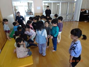 2人組になって行うものもあり、ぱんだ組のお兄さんお姉さんが、きりん組の子どもたちを誘いに来てくれている様子です。