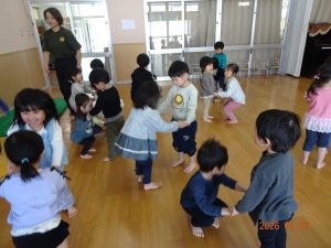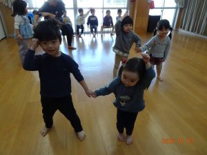 そしてペアになると、「ふね」という曲に合わせて体を動かしています。手を繋ぎ、「お~ふね~は~ぎっちらこ~♪」と歌いながら前後や左右に揺れています。