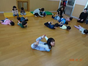 リズムは、ピアノや歌に合わせて、虫や動物等になりきったり、リズムに乗って走ったりジャンプしたりしながら全身運動を行う取り組みです。これにより脳を刺激し、感覚神経や運動神経の発達を促したり、しなやかさや表現力を育てていくことを目的としています。