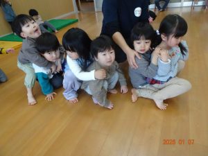 これは、先日ぱんだ組(3歳児クラス)と合同でリズムをした時の写真です。