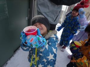 前々日にみんなで色水ジュースを作り、外に置いていたものを取り出してみると綺麗に凍っていました。