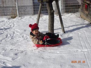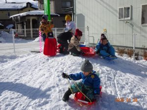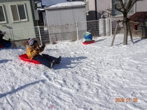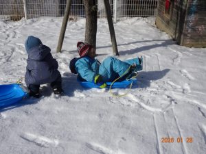 初めて雪遊びをした時には、ひとりでそりに乗って滑る子が多かったですが、回数を重ねるごとにお友達と一緒に二人乗りをしたり、おしりで滑ってみたりと遊び方にも変化が見られてきました。